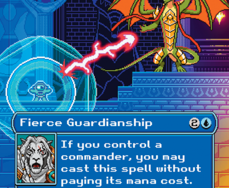 In continuation of our partnership with Extra Life, this side-scrolling, platforming drop features Fblthp braving a lava-filled adventure to battle the big bad boss Nicol Bolas and save the day! With four amazing cards and awesome video-game inspired art, including Fierce Guardianship, this drop is the perfect power-up for your next deck. Plus 50% of the product price will be donated to Extra Life!