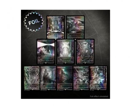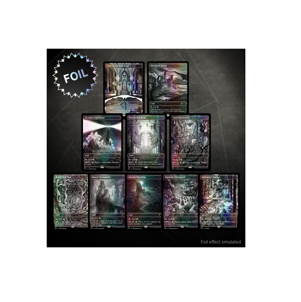 Experience ten classic Innistrad utility lands in BONE-CHILLING BLACK AND WHITE! Ten of the Midnight Hunt artists reprise their style in the eerie Eternal Night style. Alayna Danner, DZO, Nico Delort, Daria Khlebnikova, Rio Krisma, Dan Mumford, Kerby Rosanes, Jessica Seamans, Robbie Trevino, and N.C. Winters remind you that the only thing to fear is fear itself—and these lands!