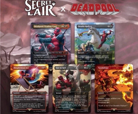 But I wasn’t expecting guests. Just, uh, kick back, relax, and . . . don’t sit on my red suit! It’s drying out. But check this out—Secret Lair made me my own Deadpool cards! Isn’t that nice? So pretty. This one even says, “trading card,” so you don’t forget. Anyway, make yourself comfortable and if you need anything, I’ll be in the kitchen making chimichangas.