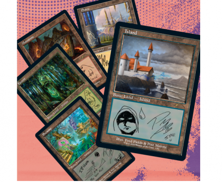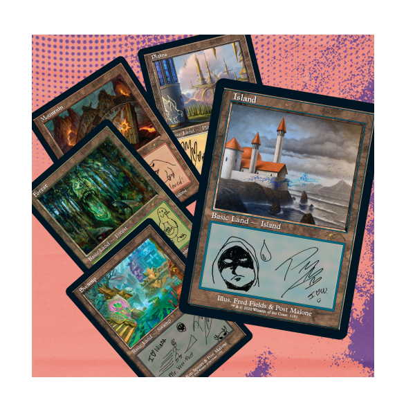 Post’s Magic: The Gathering fandom is too big to contain in a single drop, so here’s a second one! For Secret Lair x Post Malone: The Lands, not only did we collaborate to place his iconic tattoos into the scenery, he also hand-wrote the flavor text, which we then printed on every card. There are no other lands like these in the entire game—this is a totally unique way to express yourself for both fans of Posty and Magic alike. Get them while you can, because when these are gone, they’re gone for good.