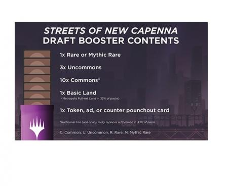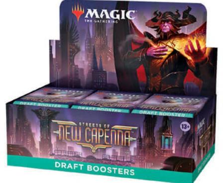 Perfect for a collector, or a fun game night of drafting, each Streets of New Capenna Draft Booster box comes with 36 Draft Booster packs. Every one of these 15-card packs contains five powerful mobster families vying for control over the streets.