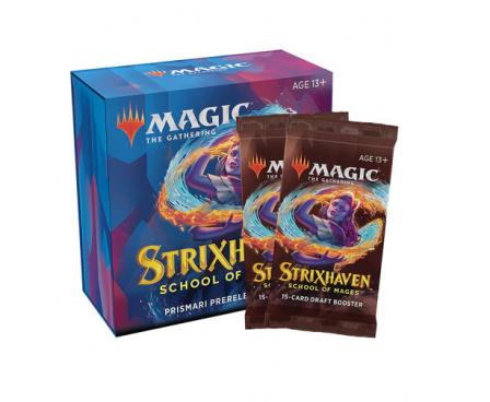 Each Strixhaven Prerelease Pack contains 5 Strixhaven Draft Boosters, 1 Strixhaven College Booster (Rare/Mythic Rare card is from the Prerelease Pack's college), 1 foil promo-stamped Rare or Mythic Rare from the set, and 1 Spindown life counter.