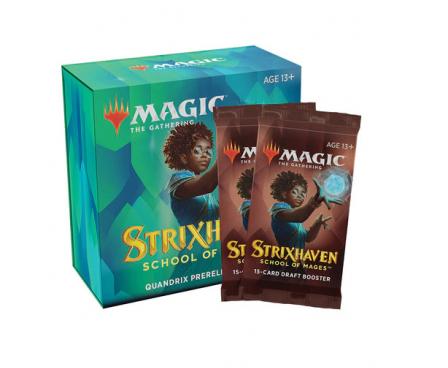 Each Strixhaven Prerelease Pack contains 5 Strixhaven Draft Boosters, 1 Strixhaven College Booster (Rare/Mythic Rare card is from the Prerelease Pack's college), 1 foil promo-stamped Rare or Mythic Rare from the set, and 1 Spindown life counter.