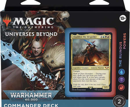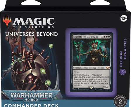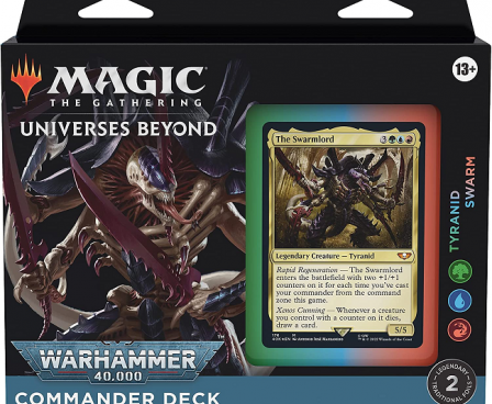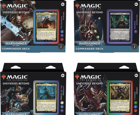This bundle includes all four Warhammer 40,000 Commander decks: The Ruinous Powers (blue-black-red), Necron Dynasties (black), Forces of the Imperium (white-blue-black), and Tyranid Swarm (green-blue-red). Each Warhammer 40,000 Commander deck set includes 1 ready-to-play 100-card Magic: The Gathering deck (2 legendary traditional foil cards, 98 non-foiled cards), 1 foil-etched display commander (a thick copy of commander card with foil embossed edge and card art), 100 double-sided tokens, 1 deck box (can hold 100 sleeve cards), 1 life tracker, 1 strategy insert, and 1 reference card.