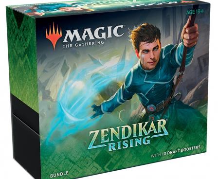 CONTENTS: 10 Zendikar Rising MTG Draft Booster packs, 40 regular-frame lands (20 foil, 20 non-foil), 1 alternate art promo card, 1 spindown life counter, 2 double-sided reference cards.