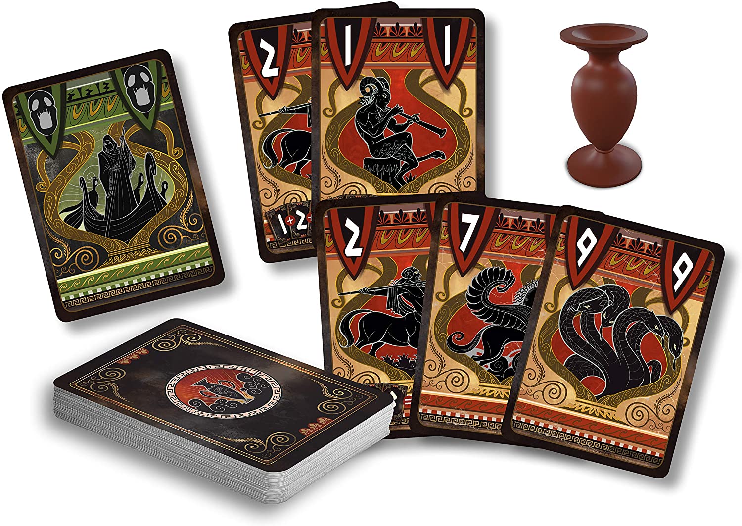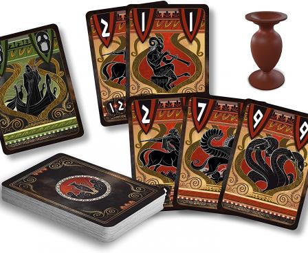During the game, the players must bluff in order to win the Amphora cards which represent the most interesting creatures. When your turn comes, offer an Amphora card to another player. They can accept it, or refuse it by offering it to another player. Collect Amphora cards in order to be the first to reach the number of points required. But be careful, if you get three Charon cards, you lose the round.