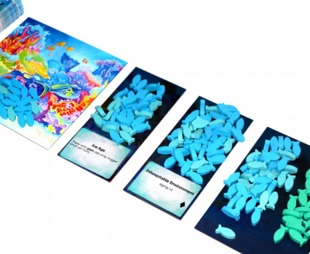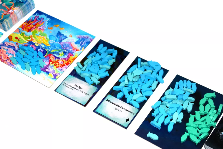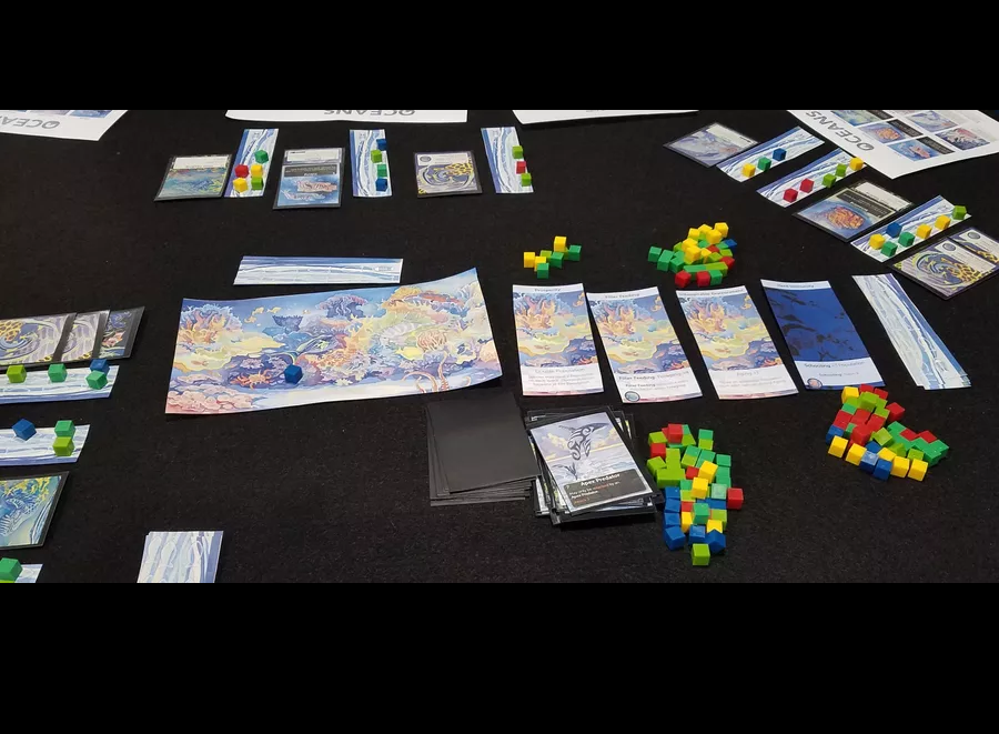 Oceans is a 2-4 player interactive engine-building game based on the natural world, where players create aquatic species, choosing traits and adapting them to a continually changing ecosystem where everything is connected. Players must adapt their interconnected ecosystem to survive against the inevitable march of time (aging), as well as a multitude of predators looking for food. The original Oceans board game has risen to the top 0.5% of games on the popular board game ratings sites.
