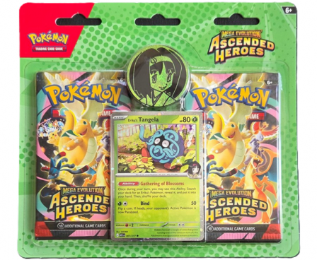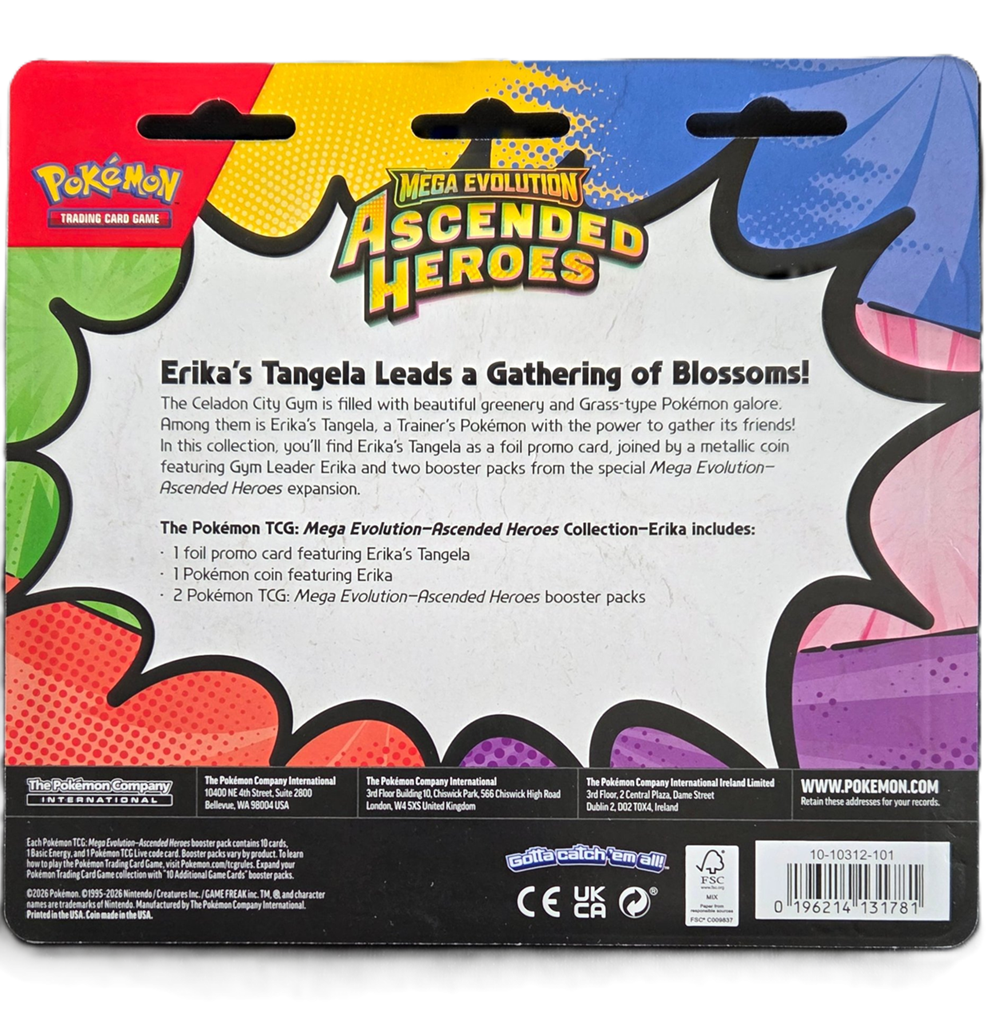The Celadon City Gym, led by Gym Leader Erika, is filled with beautiful greenery and Grass-type Pokémon galore. Visitors to Medali in the Paldea region have the chance to battle Gym Leader Larry and his Normal-type Pokémon. In this collection, you’ll find a promo card featuring either Erika’s Tangela or Larry’s Komala, a metallic coin featuring your chosen Gym Leader, and two booster packs from the Mega Evolution—Ascended Heroes expansion.