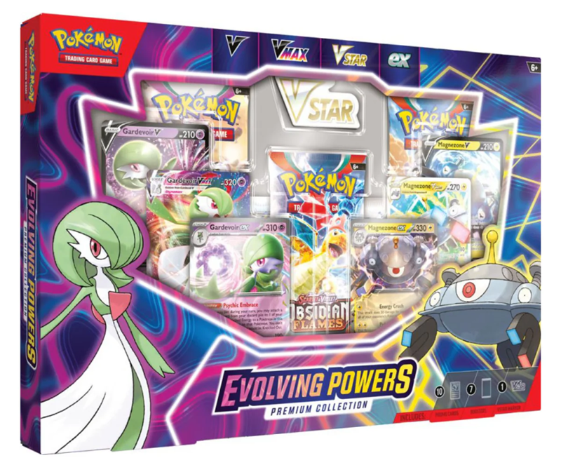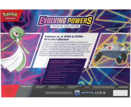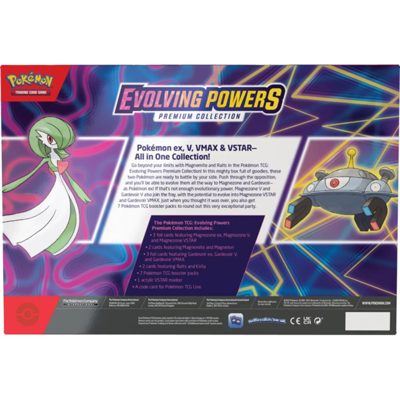 Push yourself to the limit with Magnemite and Ralts in the Pokémon TCG: Evolving Powers Premium Collection! In this impressive box full of extras, these two Pokémon are ready to join you in battle. Defy the odds and evolve them into Magnezone and Gardevoir—as Pokémon-ex! If that’s not enough evolutionary power, Magnezone V and Gardevoir V also join the fight, with the potential to evolve into Magnezone VSTAR and Gardevoir VMAX. And if that’s not enough, you’ll also receive 7 Pokémon TCG booster packs to complete this extraordinary celebration.