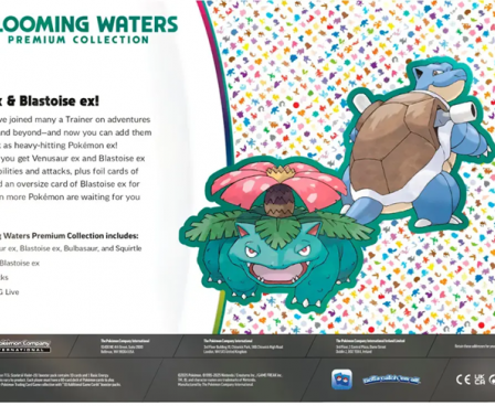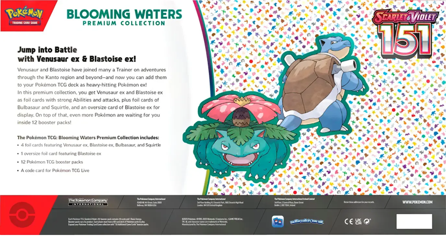 Jump into Battle with Venusaur ex & Blastoise ex. Venusaur and Blastoise have joined many a Trainer on adventures through the Kanto region and beyond—and now you can add them to your Pokémon TCG deck as heavy-hitting Pokémon ex. In this premium collection, you get Venusaur ex and Blastoise ex as foil cards with strong Abilities and attacks, plus foil cards of Bulbasaur and Squirtle, and an oversize card of Blastoise ex for display. On top of that, even more Pokémon are waiting for you inside 12 booster packs.