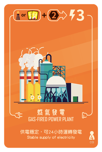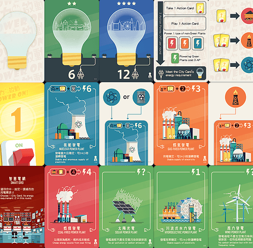 In Power On!, players should create power plants to supply energy for every city efficiently. There are four kind of power plants players can select: coal-fired, natural gas, nuclear and renewable-energy power plants. Each kind of power plants has its pros and cons. As the game end, player who obtain the most points would win the game.