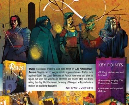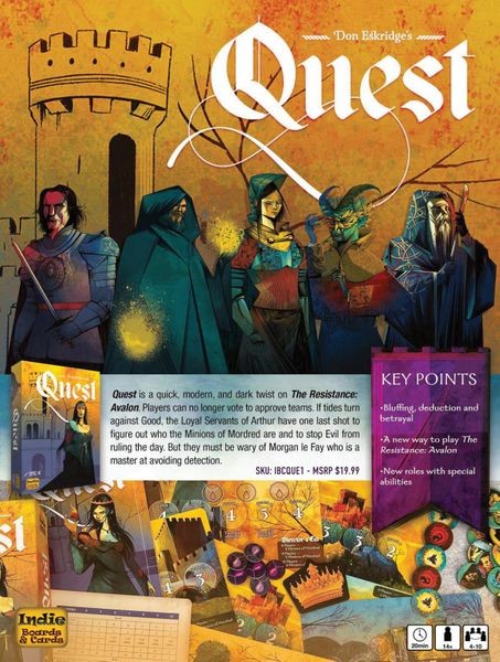 Players are secretly dealt roles that determine if their allegiance is to Good or to Evil. Then, players debate, reason, and lie as they decide who to send on Quests—knowing that if just one minion of Mordred joins, the Quest could fail. Quest includes 25 different characters and many different ways to play the base game.