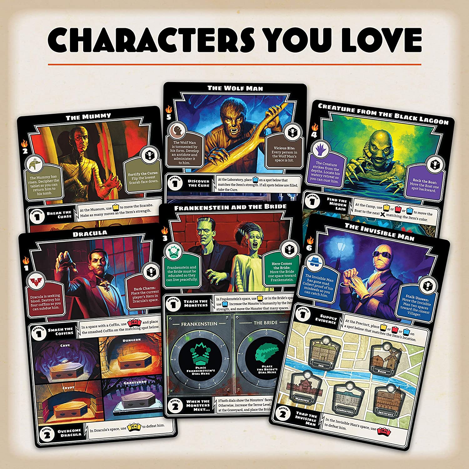 - Fun play experience – Horrified is a cooperative board game for ages 10 and up where you defend the town against Frankenstein, Dracula, the bride of Frankenstein, the Wolfman, the Mummy, the invisible Man, and the creature from the black Lagoon