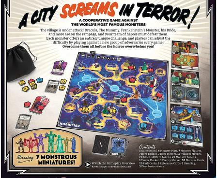 - Great replay value – 60 minute play time, for 1-5 players, Horrified's innovative style is easy-to-learn w/ varying levels of difficulty Facing the unique monsters requires different strategies, which creates a different experience every time
