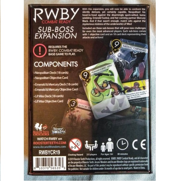 SHARED TO : 3 in stock 325000 Enter Quantity 12345678910 Add to WishlistWeight: 500 gAgesMax: 100 Ages : Players : - Game Length : CONTENT DESCRIPTION EXPANSION FOR: RWBY: COMBAT READY2–5 Players60 Min Playing TimeAge: 14+Adds 3 new objectives, and an 18 card deck for each objective Log in or register to post comments Comments