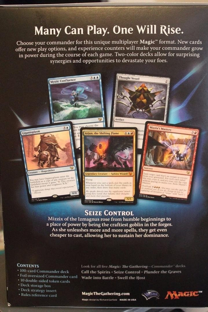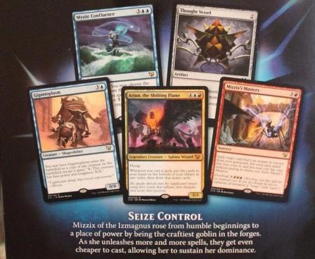 Seize Control is a 100 card Commander preconstructed deck featured in Commander 2015. It is a red and blue deck.[1] The primary theme of the deck is instants and sorceries, and the secondary theme is drawing cards. The primary new commander is Mizzix of the Izmagnus, the secondary new commander is Arjun, the Shifting Flame, and the reprint commander is Melek, Izzet Paragon.