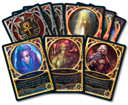 The game uses a simple resource system of "energy" that is determined randomly by a dice-roll at the beginning of each round, to make sure no round is the same. However, the outcome being the same for both players, the game balance stays even. This energy is then used in the Action Phase for conjuring minions from your hand on any of three battlefields, casting possessions that can improve your minion's traits and abilities; or sorcery cards with various direct effects. Also as an action you can add more energy to your Energy Pool, draw more cards, move minions to another battlefield etc. The choice is yours, it is just about your pure skill to handle the battle preparation!