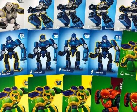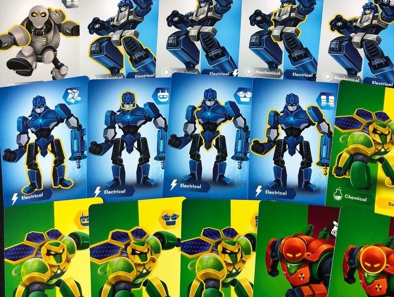 In order to build Two Robots, you need to steal, freeze, destroy and collect robot parts. Players play robot parts into stacks, with all five energy types forming them. Action cards to attack and defend are based on the number of stacks. Stacking Robot parts with similar energy types allows you to complete robots. Once a robot has been completed, a player can activate it to fight other players. All Salvagers have different abilities, so choose carefully.
