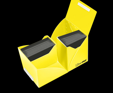Holds 180 cards in Ultra PRO Deck Protector sleeves in two compartments that fold out when the deck box is opened. Box closes securely with velcro closure on front flap. Each compartment holds 90 sleeved cards. 2 card dividers inside. Archival-safe, non-PVC material. (Sleeves or cards not included)