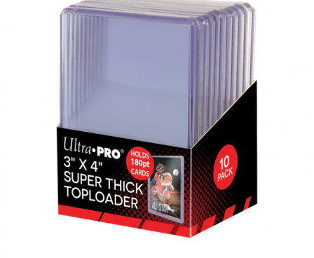 Protect your valuable trading cards with Ultra PRO's super clear, 3" x 4" "Super Thick" Toploaders for standard-sized cards up to 180pt thickness. These rigid PVC plastic holders enclose the cards and keep them clean while preventing damage. Each pack comes with 10 individual pieces.