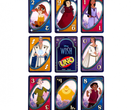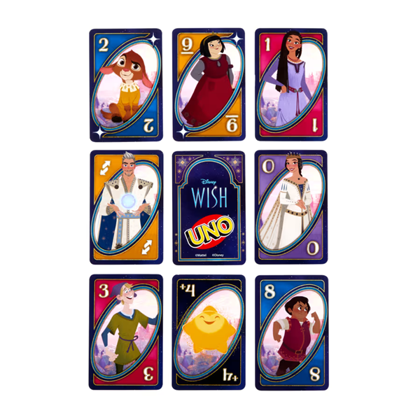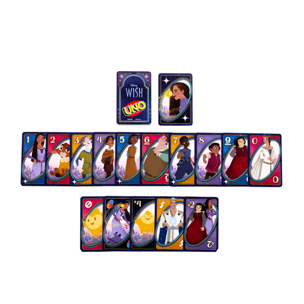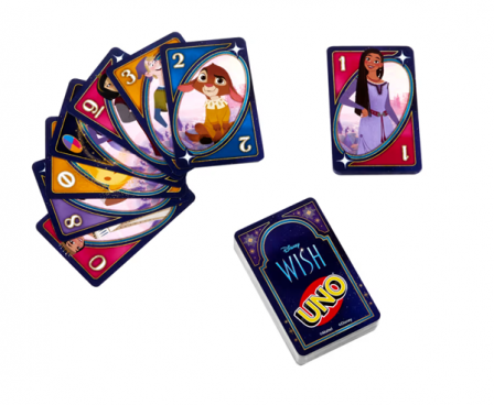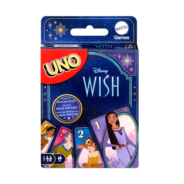 Fans of the animated movie Disney’s Wish will love playing this themed UNO card game. With a deck featuring graphics inspired by favorite characters and scenes, players try to match colors and numbers -- there’s even a special “Wishing Star” rule that may have players drawing extra cards! And when down to a last card, don’t forget to yell “UNO!” Makes a great toy for fans of the movie and card game lovers ages 7 years old and up. Colors and decorations may vary.