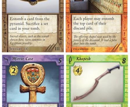 Take on the role of Egyptian nobles at the time of the pharaohs, preparing for their death and burial in the valley of the kings. Using an innovative deck-building mechanism with a crumbling pyramid, players fill their tombs with jewelry, chambers, weapons, tomb art and other treasures. The player who collects the most valuable artifacts in their tomb wins the game!