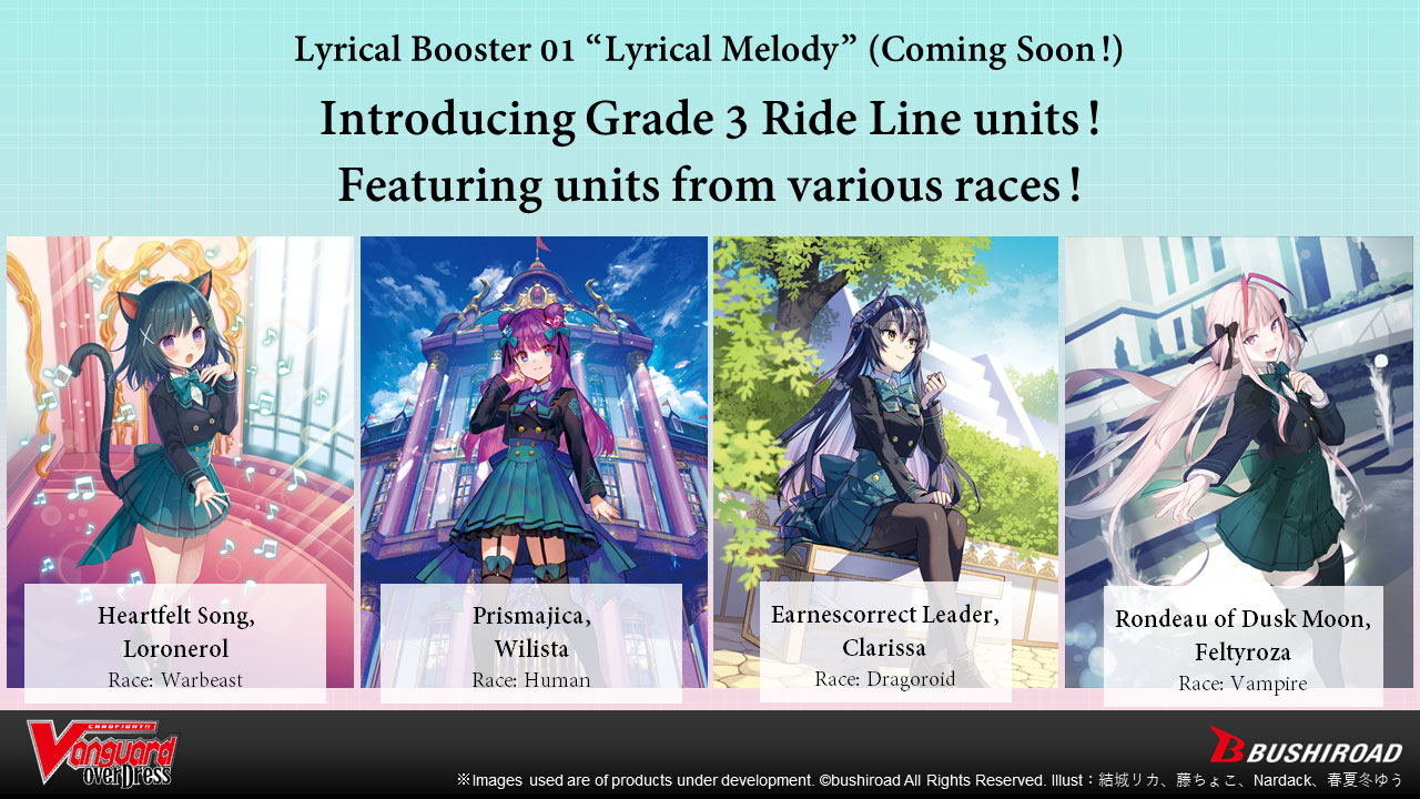 The package illustration features Yu-yu Kondo in his cross-dress outfit, as well as four main units of the new themes; Heartfelt Song, Loronerol, Earnescorrect Leader, Clarissa, Prismajica, Wilista, and Rondeau of Dusk Moon, Feltyroza.