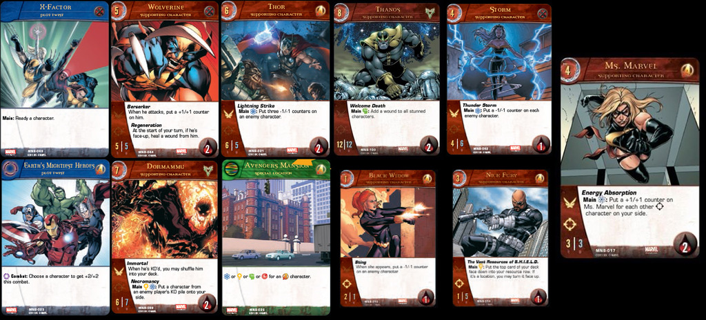 In Vs. System 2PCG, players choose a main character, build a deck with exactly sixty cards, and attempt to stun the other player's main character in a game of superhero battle. The first set — Vs System 2PCG: The Marvel Battles — contains characters only from the Marvel Universe, but future sets may add other IPs.