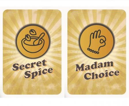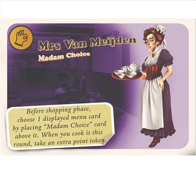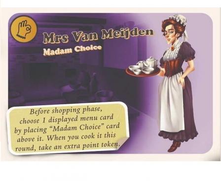 Before shopping phase, choose 1 displayed menu card by placing "Madam Choice" card above it. When you cook it this round, take an extra point token.