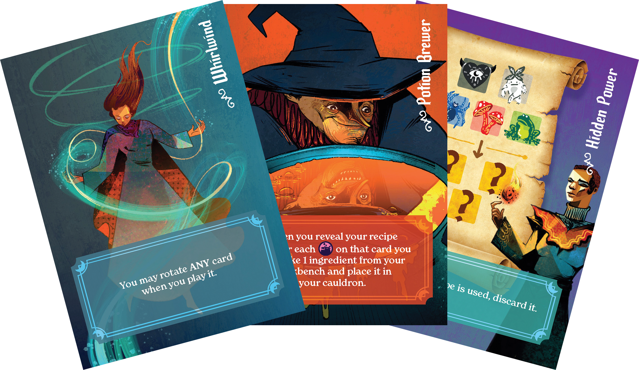 In Whirling Witchcraft, you start with a hand of four recipe cards, as well as a number of ingredients on your workbench; ingredients come in five types, and you have a limited number of spaces for each type on your workbench.