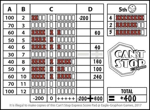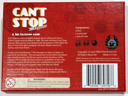 To win at Can't Stop Express, you need the courage to take risks, but also the ability to predict and plan. After each throw of the five dice, you try to choose the best combination of two pairs while also making a good choice for the fifth die. Through this effort, you are awarded points, and whoever has the most points at the end of the game — which usually takes 24-25 rolls — wins.
