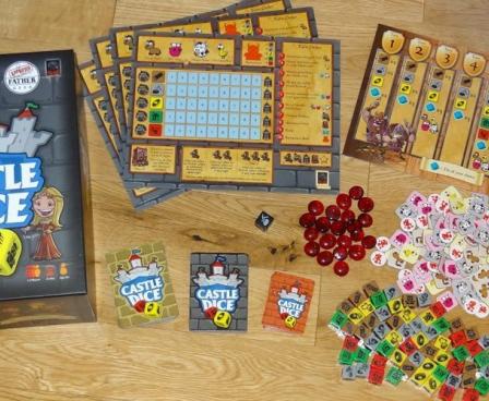 Castle Dice is a light dice-drafting game in which the players have been ordered by the king to build castles along the borders of the kingdom. The player who can create the greatest castle will become the new heir to the throne. Players will explore the land by rolling the dice, and then take turns gathering resources from them. These resources are then used to hire workers and improve castles. Players must gather and spend wisely as the Barbarians from the neighboring lands will attack players and steal their resources throughout the game. At the end of seven turns, the player who has built the greatest castle (earned the most victory points) wins the game!