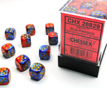 36 plastic Blue & Red Gemini Marble 6-sided Dice. Each is miniature in size - roughly 1/2 an inch per side.Gemini dice are two colors swirled together to give a marbled effect. These dice are Blue & Red, and have Gold Pips. Every set of dice is absolutely unique!