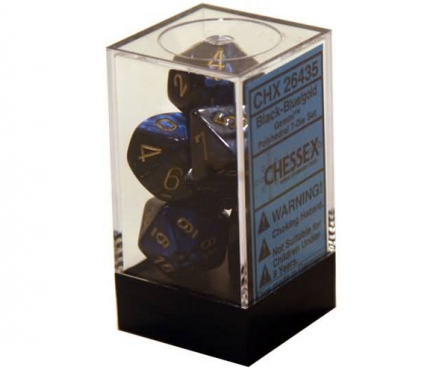 SHARED TO : 2 in stock 161000 Enter Quantity 12345678910 Add to WishlistWeight: 100 gAgesMax: 100 Ages : Players : - Game Length : CONTENT DESCRIPTION Chessex Dice - Gemini - Poly Sets Chessex Poly Set Black & Blue w/Gold (7) (MINT/New) Log in or register to post comments Comments