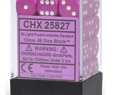 SHARED TO : 0 in stock 97000 Weight: 200 gAgesMax: 100 Ages : Players : - Game Length : CONTENT DESCRIPTION Opaque 12mm d6 36 Dice Block Light Purple/WhiteContains 36 6-sided (d6) dice Log in or register to post comments Comments