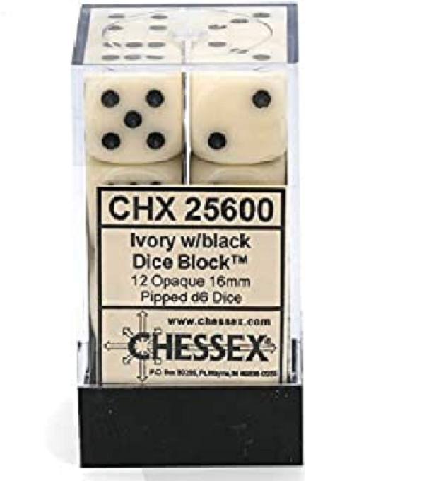 SHARED TO : 0 in stock 63000 Weight: 200 gAgesMax: 100 Ages : 12+ Players : - Game Length : CONTENT DESCRIPTION Chessex Opaque dice have a striking rich colour.These dice are ivory and have black pips. Log in or register to post comments Comments