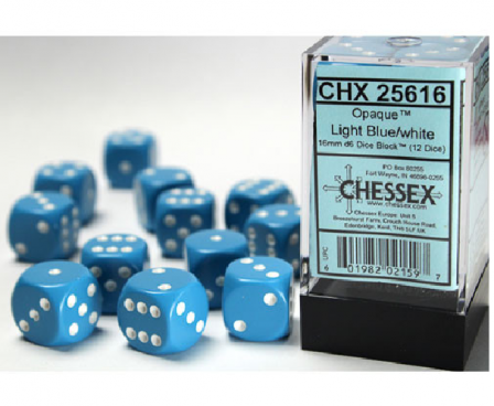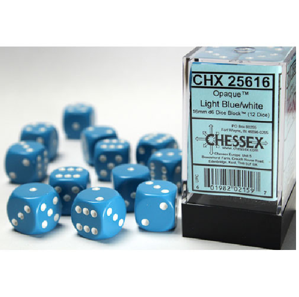 SHARED TO : 2 in stock 63000 Enter Quantity 12345678910 Add to WishlistWeight: 200 gAgesMax: 100 Ages : 12+ Players : - Game Length : CONTENT DESCRIPTION Twelve plastic 16mm Blue Opaque 6-sided dice.Chessex Opaque dice have a striking rich colour.These dice are Light Blue and have White pips. Log in or register to post comments Comments