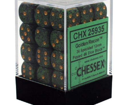 SHARED TO : 0 in stock 125000 Weight: 250 gAgesMax: 100 Ages : Players : - Game Length : CONTENT DESCRIPTION CHX25935 Golden Recon Speckled 12mm d6 (36) by Chessex Dice Set of 36 12mm d6 dice in dice block. Log in or register to post comments Comments