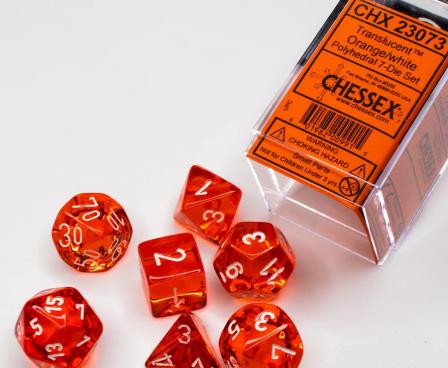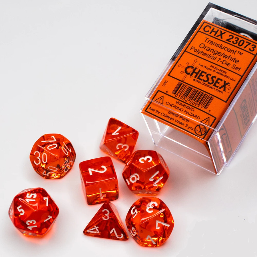 - Chessex Translucent Polyhedral Orange/White 7 Dice Set