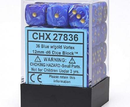 SHARED TO : 0 in stock 225000 Weight: 250 gAgesMax: 100 Ages : Players : - Game Length : CONTENT DESCRIPTION Chessex Vortex 12mm d6 36 Dice Block Blue/Gold CHX36 D6 Dice Log in or register to post comments Comments