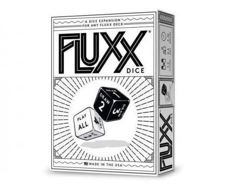 Fluxx Dice is an expansion that can be used with any Fluxx card game. The components are two dice — one showing "Draw 1", "Draw 2", etc. while the other shows "Play 1", "Play 2", "Play All", etc. — and five cards. Instead of following the basic Fluxx rules, each turn players roll the draw and play dice, then follow the new rules set by their roll!