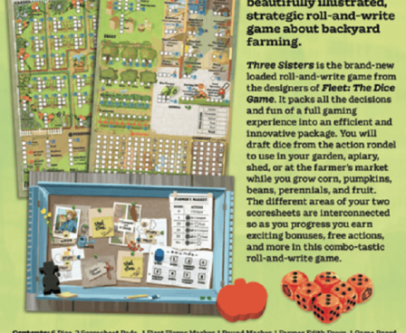 Three Sisters is a strategic roll-and-write game about backyard farming. Three Sisters is named after an indigenous agricultural technique still widely used today in which three different crops — in this case, pumpkins, corn, and beans — are planted close together. Corn provides a lattice for beans to climb, the beans bring nitrogen from the air into the soil, and the squash provides a natural mulch ground cover to reduce weeds and keep pests away.