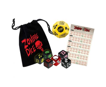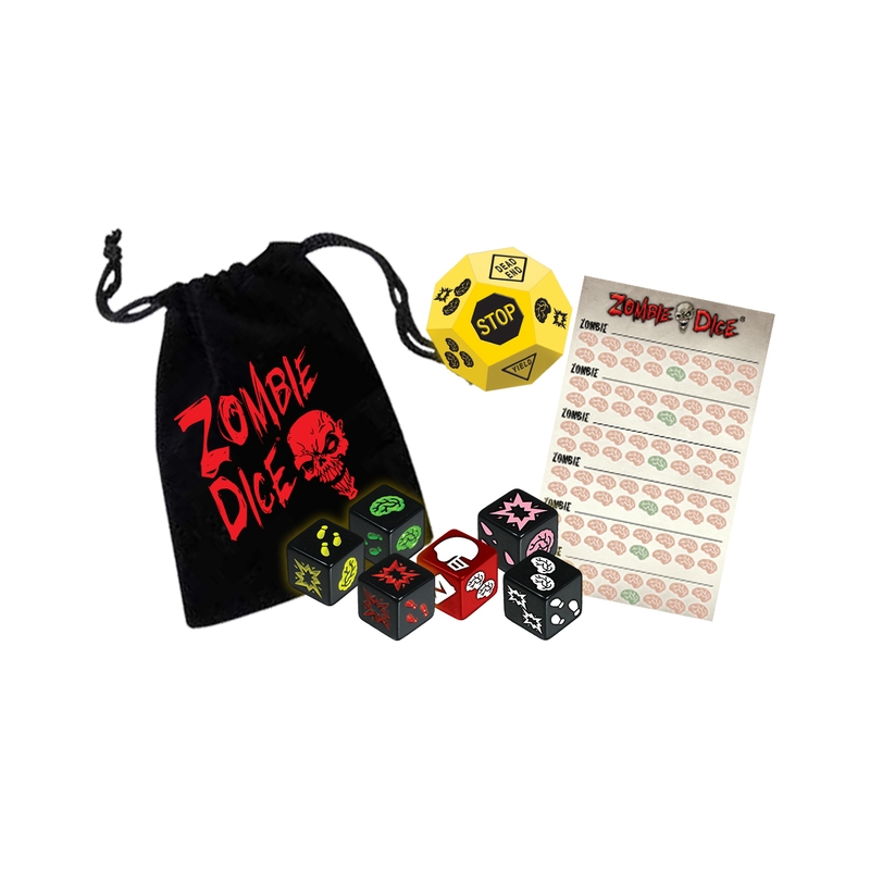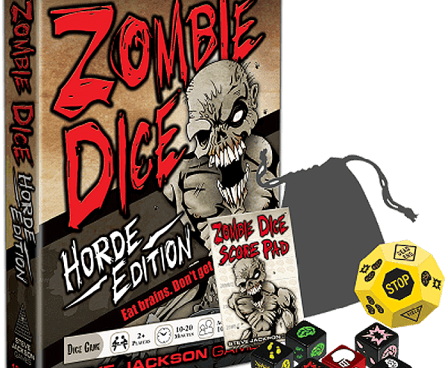 Zombie Dice Horde Edition includes the Zombie Dice base game, as well as the Zombie Dice 2: Double Feature and Zombie Dice 3: School Bus expansions, along with a cloth bag and a scorepad to keep track of those tasty brains.