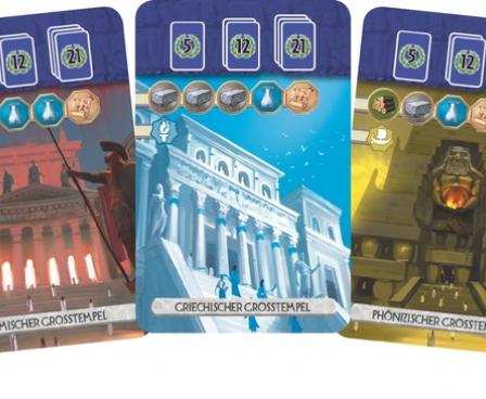 What's more, instead of adding three guild cards to the deck for Age III, you add three of five Grand Temples. Each Grand Temple belongs to a different Mediterranean culture, and if you possess a mythology token from that culture, you can build the temple for free. These temples are worth a total of 5, 12, or 21 points, depending on how many you build.