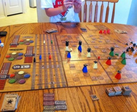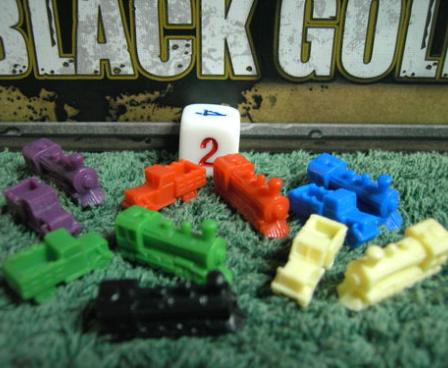 Black Gold is a board game of drilling and discovery for 2-5 prospectors, and play can last from 1-2 hours. Competitors attempt to claim the best wells, bid wisely against their neighbors, and sell their oil at the highest price in order to finish the game with the most money when the Oil Barons train reaches the last track.