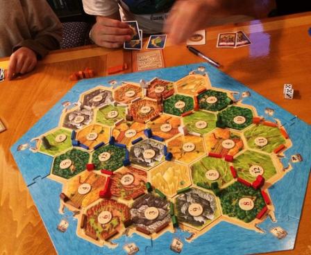 Allows you to add up to two more opponents to The Settlers of Catan. The only change in the rules is that there is a building round at the end of each turn in which any player can build.