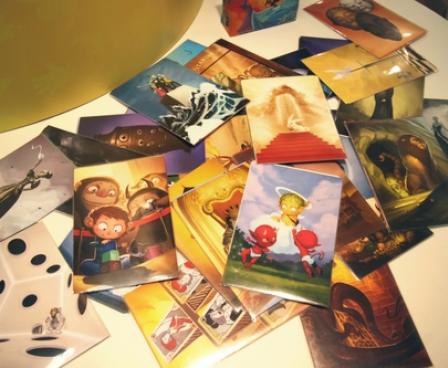 As for the game play in Dixit, each round one player takes on the role of Storyteller, choosing one card from his hand, then telling a story, singing a ditty or otherwise doing something that in his opinion is associated with the played card. Each other player then chooses one card in her own hand and gives it to the Storyteller in secret. These cards are shuffled and revealed, then players vote on which card was played by the Storyteller. If no one or everyone votes for the Storyteller, then he receives no points; if he received some votes but not all the votes, he scores based on the number of votes received. Each player who submitted a correct vote or who received a vote on her card submission also scores. After a certain number of rounds, the player with the most points wins.