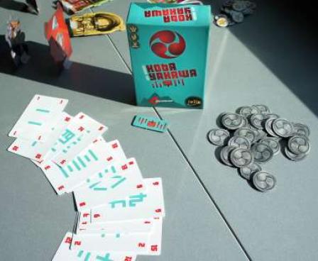 The rules are simple: Each round, players take a turn and either discard their card face up in front of them and take a new one from the deck, or turn a card from the deck to replace the current Kobayakawa. After each player has taken a turn, they each decide if they want to compete for this round by putting a crest token on their card. Players that decided to compete then all reveal their card at once and compare their number.