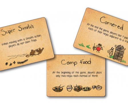 One of the Small Box/Big Fun line of games from Action Phase Games, Ninja Camp pits animal martial artists against one another in a training exercise where the best will become the personal ninja apprentice of Sensei Saru. Each player starts with two cards, each representing a ninja skill, with the rest of the deck making up the game board. By using the cards in their hand, players navigate the board, adding new skills to their hand as they doand leaving fewer movement options for their fellow campers. Each player also has a unique ninja ability that he can use once per game to try to turn the game in his favor. A game that sets up and plays in thirty minutes or less, Ninja Camp is sure to provide hours of fun for families and future ninjas!
