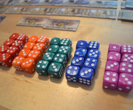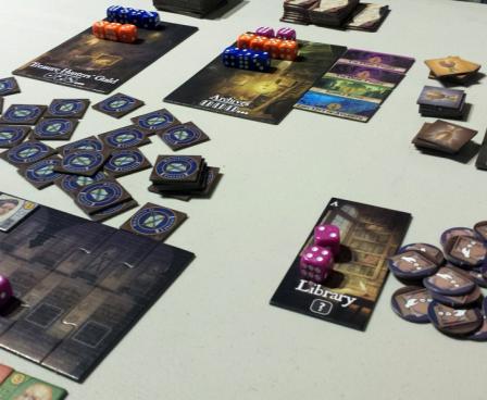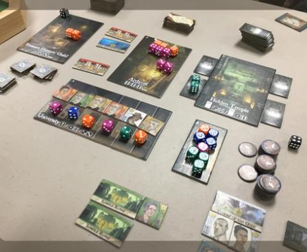 Order of the Gilded Compass uses a variable set-up in order to create fresh and interesting game play experiences. Each game has five locations in play to which players may assign their dice for various kinds of treasures and bonuses, and the game includes nine different buildings to allow for many unique combinations.